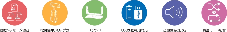 | 再生モード | 1音声をリピート再生・全ての音声をリピート再生 |