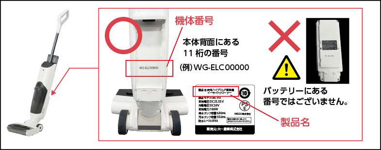 対象機種と機体ナンバーの確認方法 5年保証サービス ユーザー登録 対象機種と機体ナンバーの確認方法 保証規定 個人情報のお取り扱い 業務用コードレス掃除機 極コードレス タンクの背面にあるラベルの機体番号をご確認ください。 床用ハイブリッドクリーナー イーライトクリーナー バッテリーを外し、本体背面に記載されている機体番号をご確認ください。